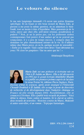 Je me suis longtemps demandé s'il existait une poésie féminine spécifique. En lisant ce très beau recueil de Maria Zaki, je persiste à me poser la même question. Mais, penserais-je de la sorte, parce que chez elle, prévalent retenue, pondération et pudeur ? Non, car les poétesses arabes contemporaines font preuve d'une audace qu'on ne pouvait pas soupçonner. " Enfin je le regarde / Sans cacher mon désir / Sans détourner les yeux / Ni clore les paupières / Sur un autre que lui ! ". Abdelmajid Benjelloun.