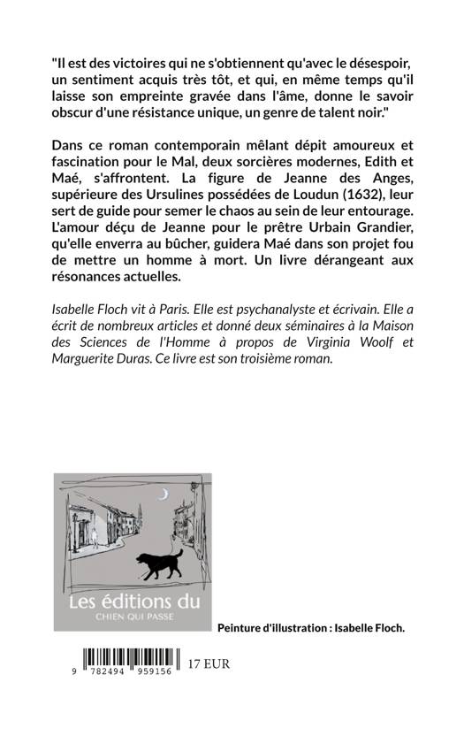 Dans ce roman contemporain mêlant dépit amoureux et fascination pour le Mal, deux sorcières modernes, Edith et Maé, s'affrontent. La figure de Jeanne des Anges, supérieure des Ursulines possédées de Loudun (1632), leur sert de guide pour semer le chaos au sein de leur entourage. L'amour déçu de Jeanne pour le prêtre Urbain Grandier, qu'elle enverra au bûcher, guidera Maé dans son projet fou de mettre un homme à mort. Un livre dérangeant aux résonances actuelles.