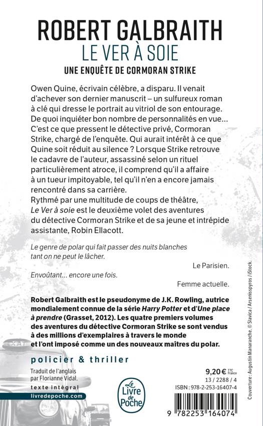 Rythmé par une multitude de coups de théâtre, Le Ver à Soie est le deuxième volet des aventures du détective Cormoran Strike et de sa jeune et intrépide assistante, Robin Ellacott.