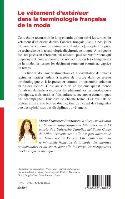 Cette étude reconstruit le long chemin qu'ont suivi les termes du vêtement d'extérieur depuis l'ancien français jusqu'à nos jours (de mantel à caban, de redingote à doudoune), adoptant la piste de recherche de la terminologie diachronique longue. Ainsi que le font les pièces du vêtement, qui naissent, puis se transforment, qui disparaissent pour apparaître de nouveau selon les changements de la mode, les termes les désignant semblent soumis au caprice du temps.