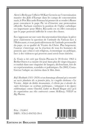 Le Vicaire a été créé par Erwin Piscator le 20 février 1963 à Berlin-Ouest et a ensuite été joué dans plus de vingt-cinq pays et traduit dans une vingtaine de langues, déclenchant lors de ses représentations, scandales et polémiques. En 2002, Costa-Gavras l’adapte au cinéma dans le film Amen.