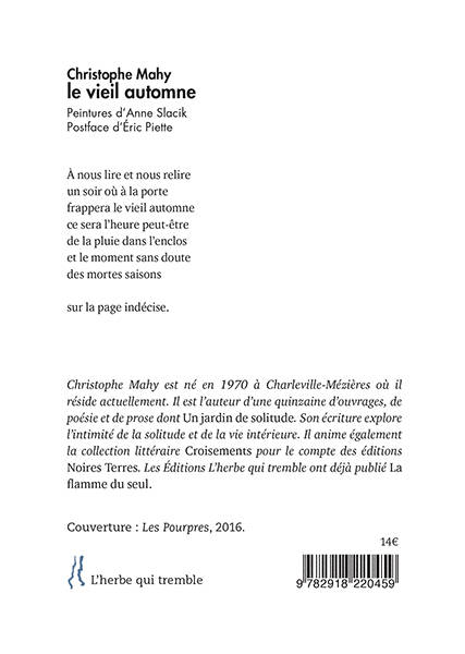 Dans la suite de poèmes du « Vieil Automne », c’est la vie qui se déploie, de murmures en murmures, sans cris, sans hargne, cette vie qui nous traverse tous, qu’on expérimente tous, si nous ne nous oublions pas nous-mêmes. Lire Christophe Mahy, c’est lire un véritable poète, c’est entrer dans la famille des résistants, vitaux, capables de réanimer l’humanité de l’homme, d’accueillir le monde.