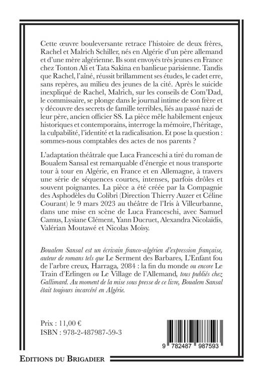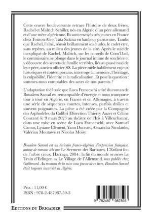 Cette œuvre bouleversante retrace l’histoire de deux frères, Rachel et Malrich Schiller, nés en Algérie d’un père allemand et d’une mère algérienne. Ils sont envoyés très jeunes en France chez Tonton Ali et Tata Sakina en banlieue parisienne. Tandis que Rachel, l’aîné, réussit brillamment ses études, le cadet erre, sans repères, au milieu des jeunes de la cité. Après le suicide inexpliqué de Rachel, Malrich, sur les conseils de Com’Dad, le commissaire, se plonge dans le journal intime de son frère et y découvre des secrets de famille terribles, liés au passé nazi de leur père, ancien officier SS. La pièce mêle habilement enjeux historiques et contemporains, interroge la mémoire, l’héritage, la culpabilité, l’identité et la radicalisation. Et pose la question : sommes-nous comptables des actes de nos parents ?