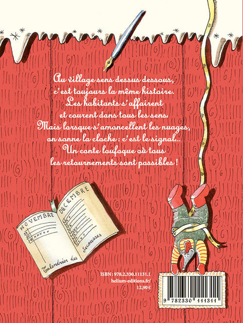 Au village sens dessus dessous, c'est toujours la même histoire. Les habitants s'affairent et courent dans tous les sens. Mais lorsque s'amoncellent les nuages, on sonne la cloche : c'est le signal... Un conte loufoque où tous les retournements sont possibles !