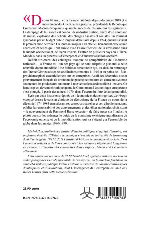 Écrit par deux historiens réputés de l'économie et des entreprises, Le Virage manqué dresse le constat clinique du décrochage de la France au cours de la décennie 1974-1984 en analysant ses causes structurelles et son déroulement, sans oublier la responsabilité des gouvernements et des élites nationales choisissant - le gouvernement de Raymond Barre excepté - de faire peser sur l'industrie plutôt que sur les ménages le poids de la contrainte extérieure grandissante de l'économie ouverte et de la mondialisation qui va s'étendre à l'ensemble du globe dans les années 1980-1990.