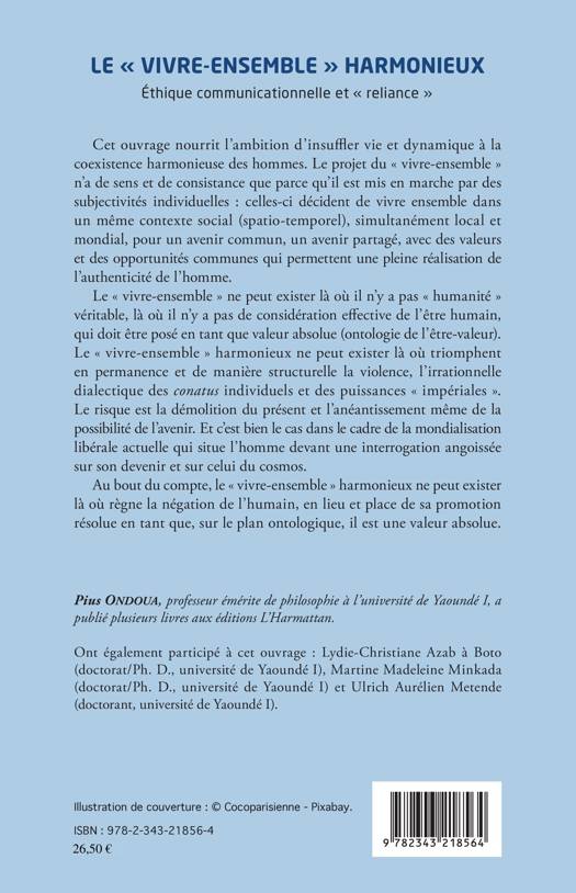 Cet ouvrage nourrit l'ambition d'insuffler vie et dynamique à la coexistence harmonieuse des hommes. Le projet du « vivre-ensemble » n'a de sens et de consistance que parce qu'il est mis en marche par des subjectivités individuelles. Le « vivre-ensemble » ne peut exister là où il n'y a pas « humanité » véritable et le « vivre-ensemble » harmonieux ne peut exister là où triomphent la violence, l'irrationnelle dialectique des conatus individuels et et des puissances « impériales ». Au bout du compte, il ne peut exister là où règne la négation de l'humain, en lieu et place de sa promotion résolue en tant que, sur le plan ontologique, il est une valeur absolue.