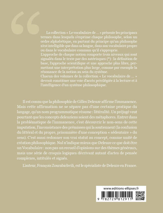 Il est connu que la philosophie de Gilles Deleuze affirme l'immanence. Mais cette affirmation ne se sépare pas d'une certaine pratique du langage, qu'un nom programmatique résume : littéralité. Un préjugé veut pourtant que les concepts deleuziens soient des métaphores. Entrer dans la problématique de l'immanence, c'est découvrir le non-sens de cette imputation, l'inconsistance des prémisses qui la soutiennent (la confusion du littéral et du propre, prisonnière d'une conception « sédentaire » du sens). C'est aussi redonner son vrai statut au concept, comme unité de création philosophique. Nul n'indique mieux que Deleuze ce que doit être un Vocabulaire : non pas un recueil d'opinions sur des thèmes généraux, mais une série de croquis logiques décrivant autant d'actes de pensée complexes, intitulés et signés.