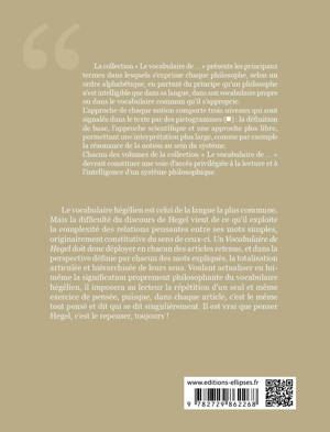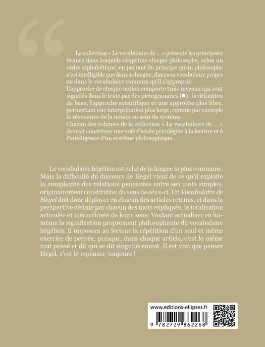 Le vocabulaire hégélien est celui de la langue la plus commune. Mais la difficulté du discours de Hegel vient de ce qu’il exploite la complexité des relations pensantes entre ses mots simples, originairement constitutive du sens de ceux-ci. Un Vocabulaire de Hegel doit donc déployer en chacun des articles retenus, et dans la perspective définie par chacun des mots expliqués, la totalisation articulée et hiérarchisée de leurs sens. Voulant actualiser en lui-même la signification proprement philosophante du vocabulaire hégélien, il imposera au lecteur la répétition d’un seul et même exercice de pensée, puisque, dans chaque article, c’est le même tout pensé et dit qui se dit singulièrement. Il est vrai que penser Hegel, c’est le repenser, toujours !