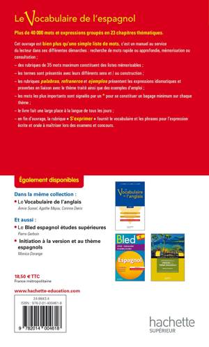 Plus de 40 000 mots et expressions groupés en 24 chapitres thématiques, – les termes sont présentés avec leur structure ; – les mots principaux sont signalés ; – les principales collocations (adjectifs, verbes, noms couramment associés à un mot) sont données ; –des exemples d’emploi et les expressions utiles – tous les outils pour l’expression écrite et orale, à maîtriser lors des examens et concours.