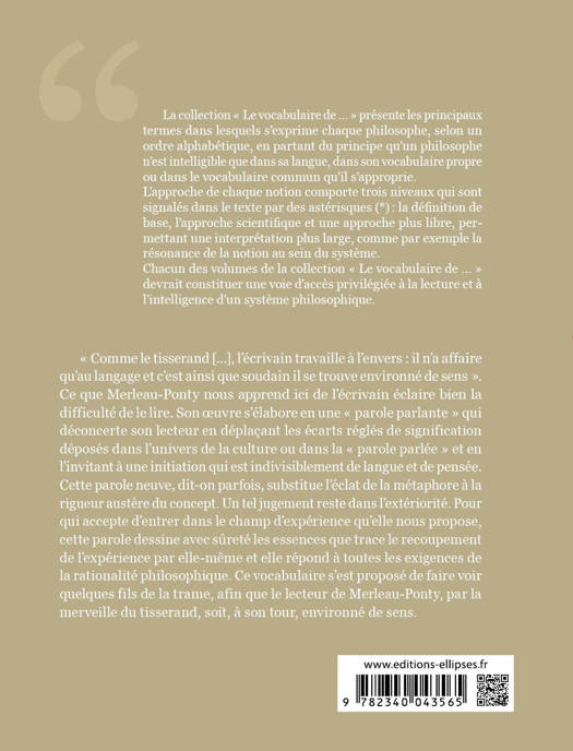 « Comme le tisserand […], l'écrivain travaille à l'envers : il n'a affaire qu'au langage et c'est ainsi que soudain il se trouve environné de sens ». Ce que Merleau-Ponty nous apprend ici de l'écrivain éclaire bien la difficulté de le lire. Son œuvre s'élabore en une « parole parlante » qui déconcerte son lecteur en déplaçant les écarts réglés de signification déposés dans l'univers de la culture ou dans la « parole parlée » et en l'invitant à une initiation qui est indivisiblement de langue et de pensée. Cette parole neuve, dit-on parfois, substitue l'éclat de la métaphore à la rigueur austère du concept. Un tel jugement reste dans l'extériorité. Pour qui accepte d'entrer dans le champ d'expérience qu'elle nous propose, cette parole dessine avec sûreté les essences que trace le recoupement de l'expérience par elle-même et elle répond à toutes les exigences de la rationalité philosophique. Ce vocabulaire s'est proposé de faire voir quelques fils de la trame, afin que le lecteur de Merleau-Ponty, par la merveille du tisserand, soit, à son tour, environné de sens.