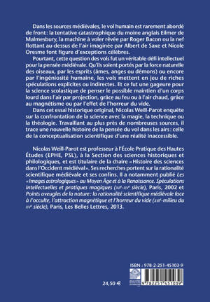 Dans les sources medievales, le vol humain est rarement aborde de front: la tentative catastrophique du moine anglais Eilmer de Malmesbury, la machine a voler revee par Roger Bacon ou la nef flottant au-dessus de l'air imaginee par Albert de Saxe et Nicole Oresme font figure d'exceptions celebres. Pourtant, cette question des vols fut un veritable defi intellectuel pour la pensee medievale. Qu'ils soient portes par la force naturelle des oiseaux, par les esprits (ames, anges ou demons) ou encore par l'ingeniosite humaine, les vols mettent en jeu de riches speculations explicites ou indirectes. Et ce fut une gageure pour la science scolastique de penser le possible maintien d'un corps lourd dans l'air par projection, grace au feu ou a l'air chaud, grace au magnetisme ou par l'effet de l'horreur du vide. Dans cet essai historique original, Nicolas Weill-Parot enquete sur la confrontation de la science avec la magie, la technique ou la theologie. Travaillant au plus pres de nombreuses sources, il trace une nouvelle histoire de la pensee du vol dans les airs: celle de la conceptualisation scientifique d'une realite inaccessible.