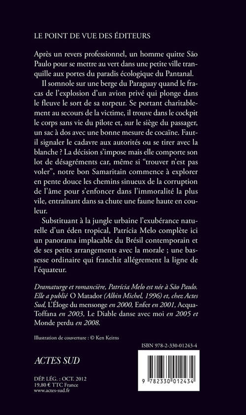 Après un revers professionnel, un homme quitte São Paulo pour se mettre au vert dans une petite ville tranquille aux portes du paradis écologique du Pantanal. Il somnole sur une berge du Paraguay quand le fracas de l'explosion d'un avion privé qui plonge dans le fleuve le sort de sa torpeur. Se portant charitablement au secours de la victime, il trouve dans le cockpit le corps sans vie du pilote et, sur le siège du passager, un sac à dos avec une bonne mesure de cocaïne. Fautil signaler le cadavre aux autorités ou se tirer avec la blanche ? La décision s'impose mais elle comporte son lot de désagréments car, même si "trouver n'est pas voler", notre bon Samaritain commence à explorer en pente douce les chemins sinueux de la corruption de l'âme pour s'enfoncer dans l'immoralité la plus vile, entraînant dans sa chute une faune haute en couleur. Substituant à la jungle urbaine l'exubérance naturelle d'un éden tropical, Patrícia Melo complète ici un panorama implacable du Brésil contemporain et de ses petits arrangements avec la morale ; une bassesse ordinaire qui franchit allégrement la ligne de l'équateur.