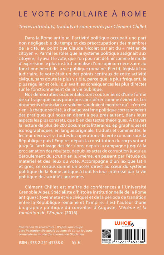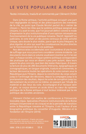 Presentation et analyse de plus de 200 documents litteraires, epigraphiques et iconographiques originaux qui concernent la pratique du vote du peuple sous la Republique et l'Empire romains. Electif, legislatif ou judiciaire, le vote est l'un des points centraux de l'activite civique et a des consequences directes sur le fonctionnement de la vie publique.