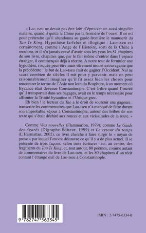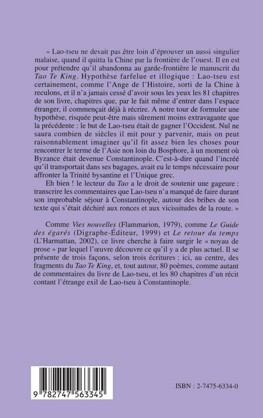"Lao-Tseu ne devait pas être loin d'éprouver un aussi singulier malaise, quand il quitta la Chine pour la frontière de l'ouest où il abandonna au garde-frontière le manuscrit du "Tao Te King". Son but était de gagner l'Occident. Nul ne saura combien de siècles il mit pour y parvenir, mais on peut raisonnablement imaginer qu'il fit assez bien les choses pour rencontrer le terme de l'Asie non loin du Bosphore, à un moment où Byzance était devenue Constantinople". Ainsi, ces 80 poèmes content l'étrange exil de Lao-Tseu à Constantinople.