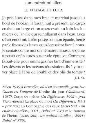Je pris Luca dans mes bras et marchai jusqu'au bord de l'océan. Il faisait nuit à présent. Un cargo croisait au large et on apercevait au loin les lumières de la ville qui scintillaient dans l'eau. Luca s'était endormi, la tête posée sur mon épaule, bercé par le fracas des lames qui s'écrasaient face à nous. Je sentais contre moi sa mémoire minuscule qui se reposait enfin après cette rude épreuve. Comment faisait-elle pour emmagasiner tant d'immensité ? Les déserts et les océans réussiraient-ils à y trouver place à l'abri de l'oubli et des plis du temps ? J.-L. O. Né en 1949 à Bruxelles, où il vit et travaille, Jean-Luc Outers est l'auteur de L'ordre du jour (Gallimard, 1987), Corps de métier (La Différence, 1992 - prix Victor-Rossel), La place du mort (La Différence, 1995 - prix NCR), La Compagnie des eaux (Actes Sud, « un endroit où aller », 2001 ; Babel n° 728) et Le bureau de l'heure (Actes Sud, « un endroit où aller », 2004 ; Babel n° 859).