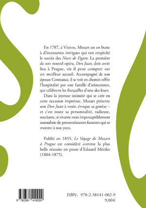 En 1787, à Vienne, Mozart est en butte à d’incessantes intrigues qui ont empêché le succès des Noces de Figaro. La première de son nouvel opéra, Don Juan, doit avoir lieu à Prague, où il peut compter sur un meilleur accueil. Accompagné de son épouse Constance, il se voit en chemin offrir l’hospitalité par une famille d’aristocrates, qui célèbrent les fiançailles d’une des leurs. Dans la joyeuse intimité qui se crée en cette occasion imprévue, Mozart présente son Don Juan à venir, évoque sa genèse – et c’est toute sa personnalité, radieuse, souriante, si vivante mais imperceptiblement assombrie de pressentiments funestes qui se montre à nos yeux. Publié en 1855, Le Voyage de Mozart à Prague est considéré comme la plus belle réussite en prose d’Eduard Mörike (1804-1875).