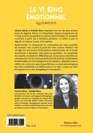 Gérard Athias et Isabelle Boos s’appuient sur l’un des plus anciens livres de Sagesse chinois et interprètent chaque hexagramme du Yi King comme une palette de couleurs émotionnelles (ou ressentis) construite à partir des 6 émotions primaires : la colère, la joie, le dégoût, la tristesse, la peur et la surprise. Expérimenter et comprendre la composition de votre nuancier de couleurs vous ouvrira la porte de votre univers intérieur. Cet ouvrage est une source d’informations extraordinaire sur le travail émotionnel. Il deviendra votre guide au quotidien : 64 possibilités de ressentis, 64 situations différentes que vous pouvez rencontrer sur votre parcours de vie. Il vous permettra de découvrir les combinaisons émotionnelles de votre hexagramme de naissance. Rappelez-vous ce chiffre?: 64 comme les cases du jeu d’échecs, souvenir embryologique de votre complétude. Ce chiffre porte en son sein deux cœurs, un cœur biologique et un cœur énergétique à reconquérir !