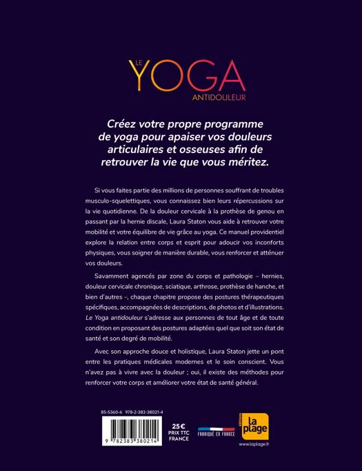Si vous faites partie des millions de personnes souffrant de troubles musculo-squelettiques, vous connaissez bien leurs répercussions sur la vie quotidienne. De la douleur cervicale à la prothèse de genou en passant par la hernie discale, Laura Staton vous aide à retrouver votre mobilité et votre équilibre de vie grâce au yoga. Ce manuel providentiel explore la relation entre corps et esprit pour adoucir vos inconforts physiques, vous soigner de manière durable, vous renforcer et atténuer vos douleurs. Savamment agencés par zone du corps et pathologie – hernies, douleur cervicale chronique, sciatique, arthrose, prothèse de hanche, et bien d’autres –, chaque chapitre propose des postures thérapeutiques spécifiques, accompagnées de descriptions, de photos et d’illustrations. Le Yoga antidouleur s’adresse aux personnes de tout âge et de toute condition en proposant des postures adaptées quel que soit son état de santé et son degré de mobilité. Avec son approche douce et holistique, Laura Staton jette un pont entre les pratiques médicales modernes et le soin conscient. Vous n’avez pas à vivre avec la douleur ; oui, il existe des méthodes pour renforcer votre corps et améliorer votre état de santé général.