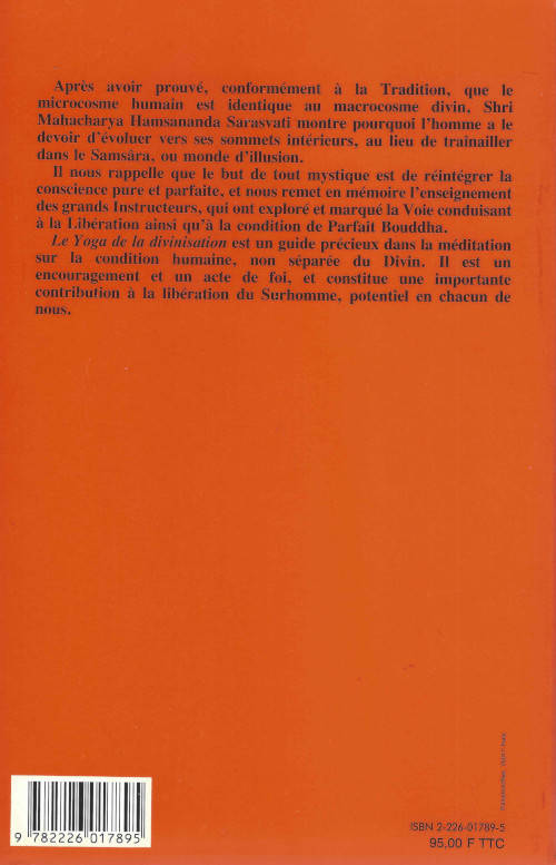 Sommaire : Vouloir la Divinisation Les buts proposés par les grandes traditions religieuses Maîtrise du subconscient et ascension spirituelle Le temple de l'Ame et le processus de Divinisation Vacuité et Union mystique Ascèses et formules mentales hindouistes Des mantras du Bouddhisme L'apport du Bardo Thödol à la maîtrise de la mort et de la renaissance Secrets initiatiques anciens, données pratiques Les pouvoirs supra-normaux et les miracles Avatars et hommes de Dieu