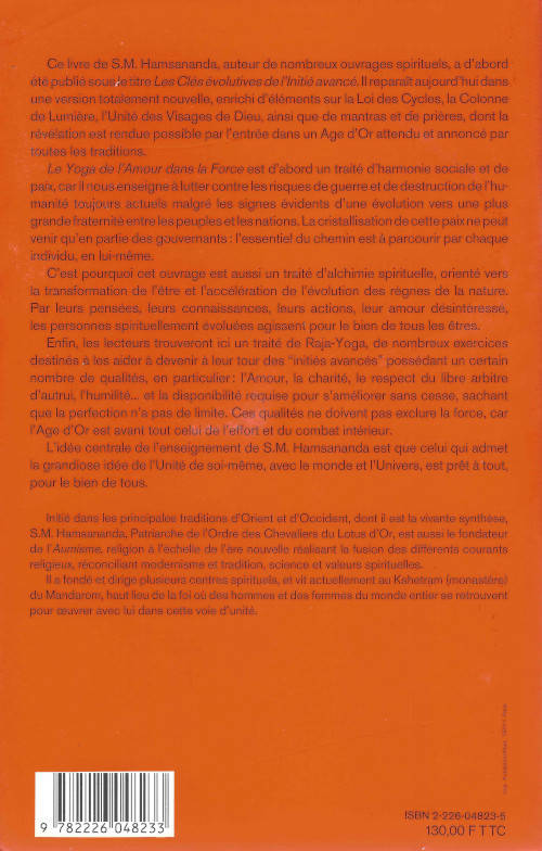 Description : « Le Yoga de l’Amour dans la Force » publié en 1990 est la réédition actualisée du livre « Les Clés Evolutives de l’Initié Avancé » paru en 1980. « Le Yoga de l’Amour dans la force» nous enseigne à lutter contre les risques de guerre et de destruction de l’humanité, à contribuer à l’harmonie sociale et à la paix. C’est un traité d’alchimie spirituelle orienté vers la transformation de l’être et vers l’accélération de l’évolution des règnes de la nature.