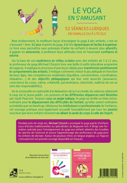 Bien évidemment, la meilleure façon d'enseigner le yoga à des enfants, c'est en s'amusant ! Avec 52 jeux inspirés du yoga, à la fois dynamiques et faciles à organiser, ce livre vous permettra sans prérequis d'aider les enfants à devenir plus attentifs, à gagner en autonomie, à améliorer leurs attitudes tout en favorisant confiance et estime. Sur la base de son expérience en milieu scolaire avec des enfants de 3 à 11 ans, le professeur de yoga Michael Chissik livre une boîte à outils éducative empreinte de sagesse. Il explique la structure d'une leçon idéale pour transformer positivement le comportement des enfants. Il indique comment choisir le jeu adéquat en fonction de leurs âges, des compétences mobilisées (équilibre, concentration, coordination, relaxation…) et des objectifs pédagogiques qui leur sont associés (assurance, conscience du corps, calme, créativité, persévérance, réactivité, maîtrise de soi ou sens des responsabilités). De la Grenouille en vadrouille à la Relaxation de la Coccinelle, les séances séduiront à coup sûr le jeune public. Les postures et les différentes séquences sont illustrées par Sarah Peacock. Toujours sous un angle ludique, le yoga se révèle un biais extraordinaire pour le dépassement des difficultés de l'enfant, qu'elles soient ordinaires ou induites par un handicap. Idéal pour les instituteurs et professionnels de l'enfance, cet ouvrage pratique sera également accueilli favorablement par tous les parents soucieux que leurs enfants évoluent en alliant la santé du corps à celle de l'esprit.