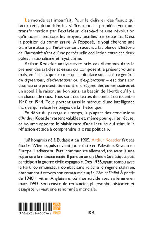 Arthur Koestler analyse avec brio ces dilemmes dans le premier des articles et essais qui composent le présent volume mais, en fait, chaque texte – qu’il soit placé sous le titre général de digressions, d’exhortations ou d’explorations – est dans son essence une protestation contre le régime des commissaires et un appel à la raison, au bon sens, au besoin de liberté qu’il y a en chacun de nous. Tous sont des textes de combat écrits entre 1940 et 1944. Tous portent aussi la marque d’une intelligence incisive qui refuse les pièges de la rhétorique. En dépit du passage du temps, la plupart des conclusions d’Arthur Koestler restent valables et, même pour qui les récuse, ce volume apporte le plaisir rare d’une lecture qui stimule la réflexion et aide à comprendre la « res politica ».