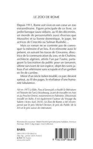 Depuis 1911, Rome voit vivre en son coeur un zoo extraordinaire. Figure principale de ce livre, ce jardin baroque saura séduire, au fil des décennies, un monde de personnalités aussi diverses que Mussolini et sa lionne domestique, le pape, les actrices de Cinecittà ou Salman Rushdie... Mais ce roman ne se contente pas de convoquer la mémoire d'un lieu. Il en réinvente aussi le présent, en suivant les traces de Giovanna, directrice de la communication du zoo, et de Chahine, architecte algérien, attirés l'un par l'autre, partageant la fascination du public pour un tamanoir, ultime survivant de son espèce, objet des soins jaloux d'un vétérinaire sans scrupule et d'un gardien en fin de carrière. Miroir d'un siècle italien troublé, ce parc devient surtout, au fil des pages, le révélateur d'une humanité fabulatrice.