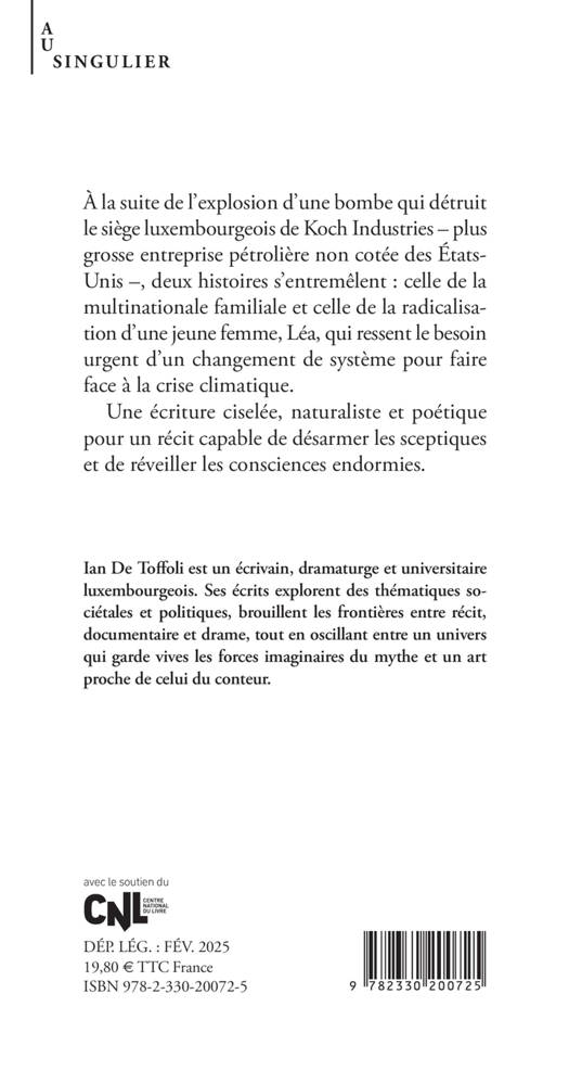 À la suite de l'explosion d'une bombe qui détruit le siège luxembourgeois de Koch Industries - plus grosse entreprise pétrolière non cotée des États-Unis -, deux histoires s'entremêlent : celle de la multinationale familiale et celle de la radicalisation d'une jeune femme, Léa, qui ressent le besoin urgent d'un changement de système pour faire face à la crise climatique. Une écriture ciselée, naturaliste et poétique pour un récit capable de désarmer les sceptiques et de réveiller les consciences endormies.