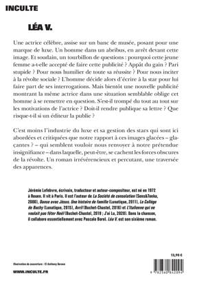 Une actrice célèbre, assise sur un banc de musée, posant pour une marque de luxe. Un homme dans un abribus, en arrêt devant cette image. Et soudain, un tourbillon de questions : pourquoi cette jeune femme a-t-elle accepté de faire cette publicité ? Appât du gain ? Pari stupide ? Pour nous humilier de toute sa réussite ? Pour nous inciter à la révolte sociale ? L'homme décide alors d'écrire à la star pour lui faire part de ses interrogations. Mais bientôt une nouvelle publicité montrant la même actrice dans une situation semblable oblige cet homme à se remettre en question. S'est-il trompé du tout au tout sur les motivations de l'actrice ? Doit-il rendre publique sa lettre ? Que risque-t-il si un éditeur la publie ? C'est moins l'industrie du luxe et sa gestion des stars qui sont ici abordées et critiquées que notre rapport à ces images glacées - glaçantes ? - qui semblent vouloir nous renvoyer à notre prétendue insignifiance - dans laquelle, peut-être, se cachent les forces obscures de la révolte. Un roman irrévérencieux et percutant, une traversée des apparences.
