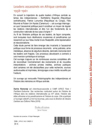 En suivant la trajectoire de quatre leaders d'Afrique centrale au temps des indépendances, Barthélémy Boganda (République centrafricaine), Patrice Lumumba (République du Congo), Félix Moumié et Ruben Um Nyobè (Cameroun), cet ouvrage interroge. En quoi l'assassinat politique peut-il constituer un moyen de réguler les relations internationales et être l'un des fondements de la construction nationale de leur pays d'origine ? Un livre qui renouvelle l'historiographie des indépendances et l'histoire des mémoires en Afrique centrale.