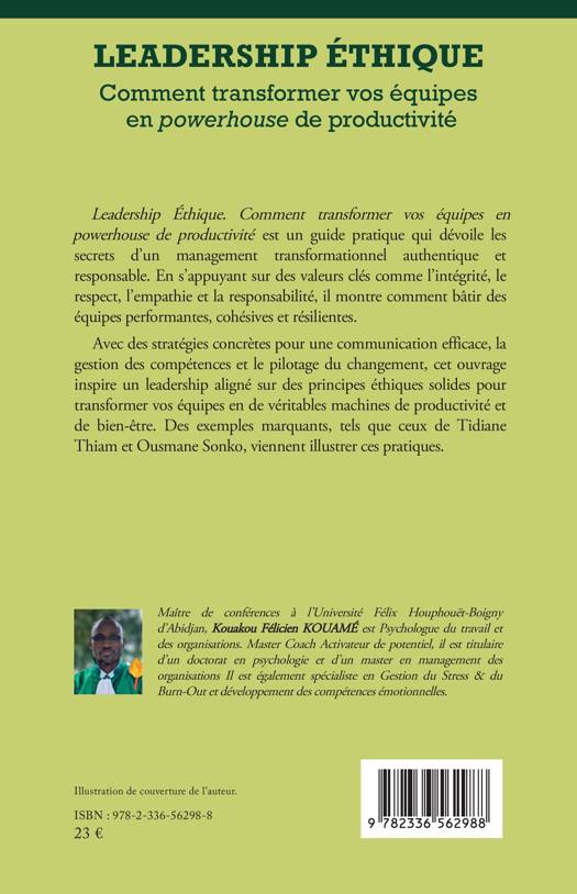 Leadership Éthique: Comment transformer vos équipes en powerhouse de productivité est un guide pratique qui dévoile les secrets d'un management transformationnel authentique et responsable. En s'appuyant sur des valeurs clés comme l'intégrité, le respect, l'empathie et la responsabilité, il montre comment bâtir des équipes performantes, cohésives et résilientes. Avec des stratégies concrètes pour une communication efficace, la gestion des compétences et le pilotage du changement, cet ouvrage inspire un leadership aligné sur des principes éthiques solides pour transformer vos équipes en de véritables machines de productivité et de bien-être. Des exemples marquants, tels que ceux de Tidiane Thiam et Ousmane Sonko, viennent illustrer ces pratiques.