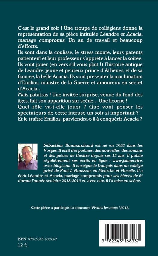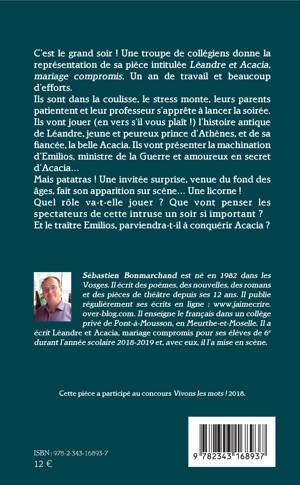 C'est le grand soir ! Une troupe de collégiens donne la représentation de sa pièce intitulée Léandre et Acacia, mariage compromis. Un an de travail et beaucoup d'efforts. Ils sont dans la coulisse, le stress monte, leurs parents patientent et leur professeur s'apprête à lancer la soirée. Ils vont jouer (en vers s'il vous plaît !) l'histoire antique de Léandre, jeune et peureux prince d'Athènes, et de sa fiancée, la belle Acacia. Ils vont présenter la machination d'Emilios, ministre de la Guerre et amoureux en secret d'Acacia. Mais patatras ! Une invitée surprise, venue du fond des âges, fait son apparition sur scène. Une licorne ! Quel rôle va-t-elle jouer ?