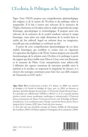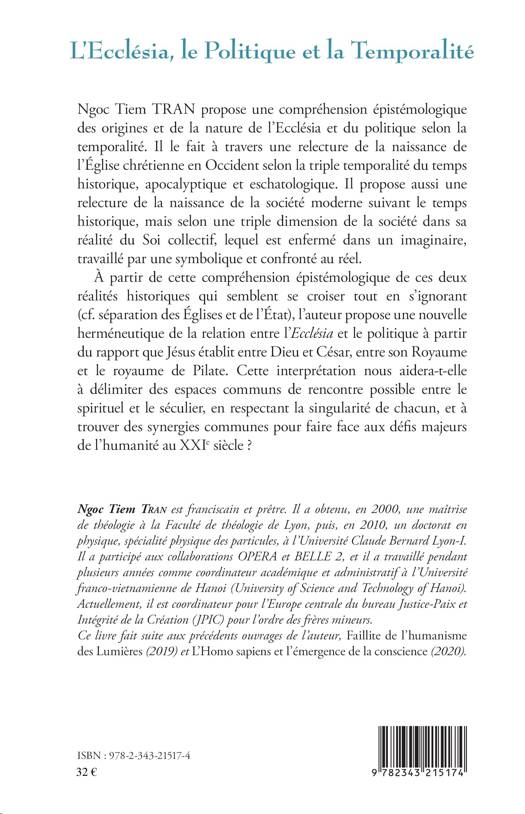 Cet ouvrage propose une compréhension épistémologique des origines et de la nature de l'Ecclésia et du politique selon la temporalité. Il propose aussi une relecture de la naissance de la société moderne suivant le temps historique, ainsi qu'une nouvelle herméneutique de la relation entre l'Ecclésia et le politique à partir du rapport que Jésus établit entre Dieu et César, entre son Royaume et le royaume de Pilate. Cette interprétation nous aidera-t-elle à délimiter des espaces communs de rencontre possible entre le spirituel et le séculier, en respectant la singularité de chacun, et à trouver des synergies communes pour faire face aux défis majeurs de l'humanité au XXIe siècle ?