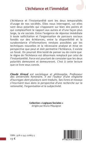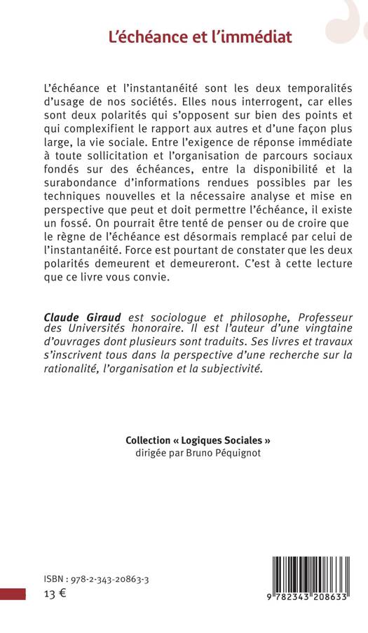L'échéance et l'instantanéité sont les deux temporalités d'usage de nos sociétés. Elles nous interrogent, car elles sont deux polarités qui s'opposent sur bien des points et qui complexifient le rapport aux autres et d'une façon plus large, la vie sociale. Entre l'exigence de réponse immédiate à toute sollicitation et l'organisation de parcours sociaux fondés sur des échéances, entre la disponibilité et la surabondance d'informations rendues possibles par les techniques nouvelles et la nécessaire analyse et mise en perspective que peut et doit permettre l'échéance, il existe un fossé.