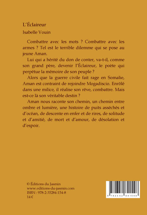 Combattre avec les mots ? Combattre avec les armes ? Tel est le terrible dilemme qui se pose au jeune Aman. Lui qui a hérité du don de conter, va-t-il, comme son grand père, devenir l’Éclaireur, le poète qui perpétue la mémoire de son peuple ? Alors que la guerre civile fait rage en Somalie, Aman est contraint de rejoindre Mogadiscio. Enrôlé dans une milice, il réalise son rêve, combattre. Mais est-ce là son véritable destin ? Aman nous raconte son chemin, un chemin entre ombre et lumière, une histoire de puits asséchés et d’océan, de descente en enfer et de rires, de solitude et d’amitié, de mort et d’amour, de désolation et d’espoir.