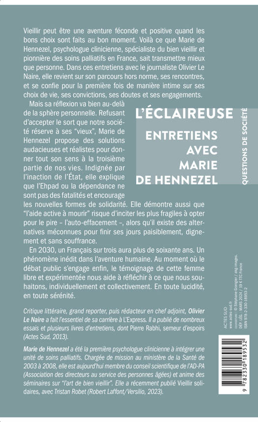 Vieillir peut être une aventure féconde et positive quand les bons choix sont faits au bon moment. Voilà ce que Marie de Hennezel, psychologue clinicienne, spécialiste du bien vieillir et pionnière des soins palliatifs en France, sait transmettre mieux que personne. Dans ces entretiens avec le journaliste Olivier Le Naire, elle revient sur son parcours hors norme, ses rencontres, et se confie pour la première fois de manière intime sur ses choix de vie, ses convictions, ses doutes et ses engagements. Mais sa réflexion va bien au-delà de la sphère personnelle. Refusant d'accepter le sort que notre société réserve à ses "vieux", Marie de Hennezel propose des solutions audacieuses et réalistes pour donner tout son sens à la troisième partie de nos vies. Indignée par l'inaction de l'État, elle explique que l'Ehpad ou la dépendance ne sont pas des fatalités et encourage les nouvelles formes de solidarité. Elle démontre aussi que "l'aide active à mourir" risque d'inciter les plus fragiles à opter pour le pire - l'auto- effacement -, alors qu'il existe des alternatives méconnues pour finir ses jours paisiblement, dignement et sans souffrance. En 2030, un Français sur trois aura plus de soixante ans. Un phénomène inédit dans l'aventure humaine. Au moment où le débat public s'engage enfin, le témoignage de cette femme libre et expérimentée nous aide à réfléchir à ce que nous souhaitons, individuellement et collectivement. En toute lucidité, en toute sérénité.
