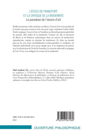 Réalité autonome et fait social, l'uvre d'art est le produit de la société sans être une copie, traduisant l'ordre établi. Entité utopique l'uvre d'art est l'antidote au désenchantement du monde. Comme tel, elle est promesse de liberté et de bonheur authentiques dans un univers de production-reproduction, soumis au principe du rendement. Et dans un monde pris par les rets d'une mondialisation technocapitaliste et totalitaire, il est impérieux de penser, avec l'école de Francfort, le caractère subversif et utopique de l'art si l'on veut endiguer les avatars de la modernité.