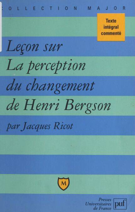 Bergson engage ses lecteurs, comme il y engageait en 1911 ses auditeurs d’Oxford, à un inhabituel effort d’attention : « Une attention à la vie qui serait suffisamment puissante, et suffisamment dégagée de tout intérêt pratique, embrasserait, dans un présent indivisé, l’histoire passée tout entière de la personne consciente, comme du continuellement présent qui serait aussi du continuellement mouvant : telle la mélodie qu’on perçoit indivisible, et qui constitue d’un bout à l’autre un perpétuel présent... » Cet ouvrage présente le texte intégral des deux conférences qui composent La perception du changement, toutes deux expliquées et commentées par Jacques Ricot, agrégé de philosophie, professeur en classes préparatoires scientifiques au lycée Clemenceau de Nantes.