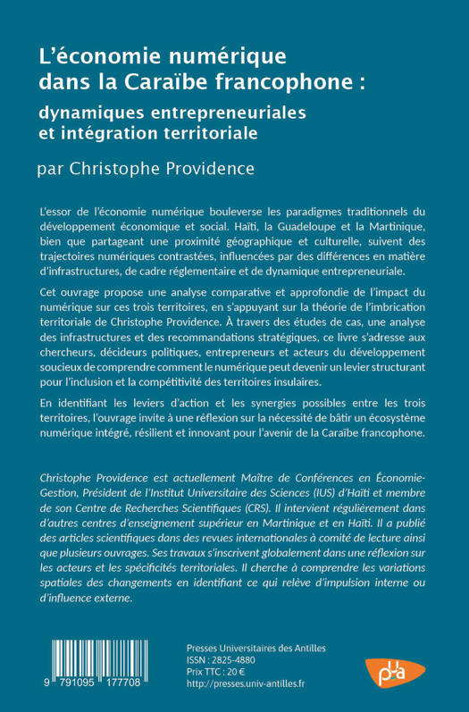 Cet ouvrage propose une analyse comparée du développement de l’économie numérique en Haïti, en Guadeloupe et en Martinique, à partir de la théorie de l’imbrication terri-toriale. Il examine les conditions d’émergence d’un écosystème numérique dans ces ter-ritoires caribéens, en articulant les dynamiques entrepreneuriales locales, les politiques publiques et les stratégies de coopération régionale. À travers des études de cas ciblées (MonCash, BèlO Digital, Kaz’Innov), l’auteur met en évidence les potentialités d’inno-vation, mais aussi les contraintes structurelles freinant l’intégration numérique. L’ouvrage formule des recommandations pour une gouvernance territoriale adaptée, en vue de ren-forcer la résilience économique et l’inclusion sociale dans la Caraïbe francophone.