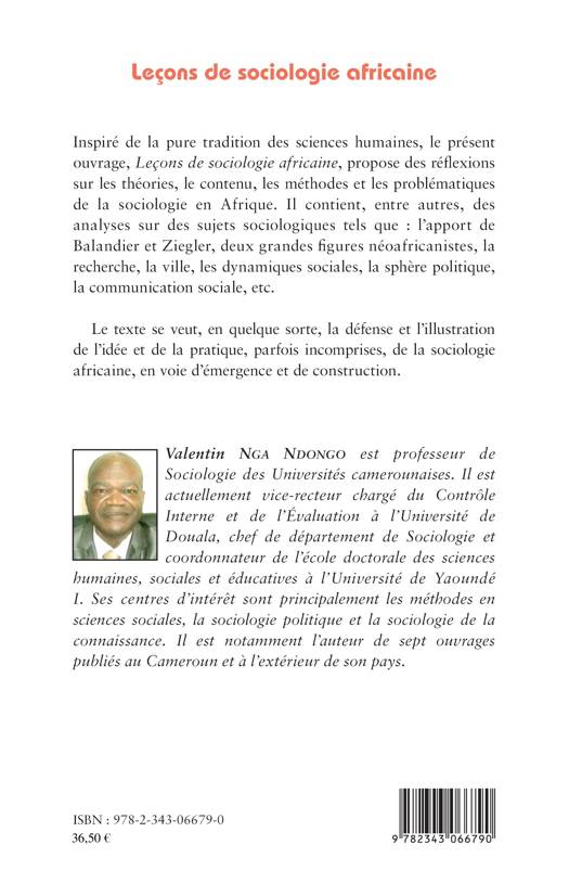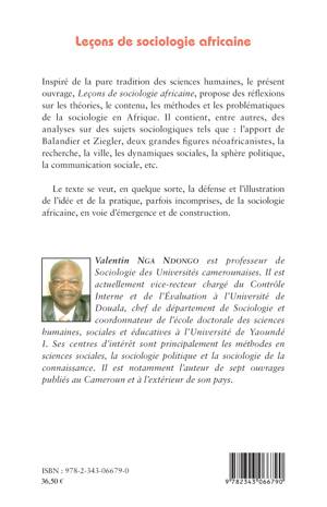 Le présent ouvrage propose des réflexions sur les théories, le contenu, les méthodes et les problématiques de la sociologie en Afrique. Il contient, entre autres, des analyses sur des sujets sociologiques tels que : l'apport de Balandier et Ziegler, deux grandes figures néoafricanistes, la recherche, la ville, les dynamiques sociales, la sphère politique, la communication sociale, etc. Le texte se veut la défense et l'illustration de l'idée et de la pratique de la sociologie africaine, en voie d'émergence et de construction.
