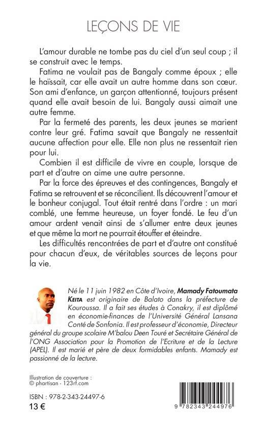 L’amour durable se construit avec le temps. Fatima ne voulait pas de Bangaly comme époux ; elle le haïssait, car elle avait un autre homme dans son coeur : son ami d’enfance, un garçon attentionné. Bangaly aussi aimait une autre femme. Par la fermeté des parents, les deux jeunes se marient contre leur gré. Combien il est difficile de vivre en couple, lorsque de part et d’autre on aime une autre personne. Par la force des épreuves et des contingences, Bangaly et Fatima se retrouvent et se réconcilient. Ils découvrent l’amour et le bonheur conjugal. Les difficultés rencontrées ont constitué pour chacun d’eux de véritables sources de leçons pour la vie.
