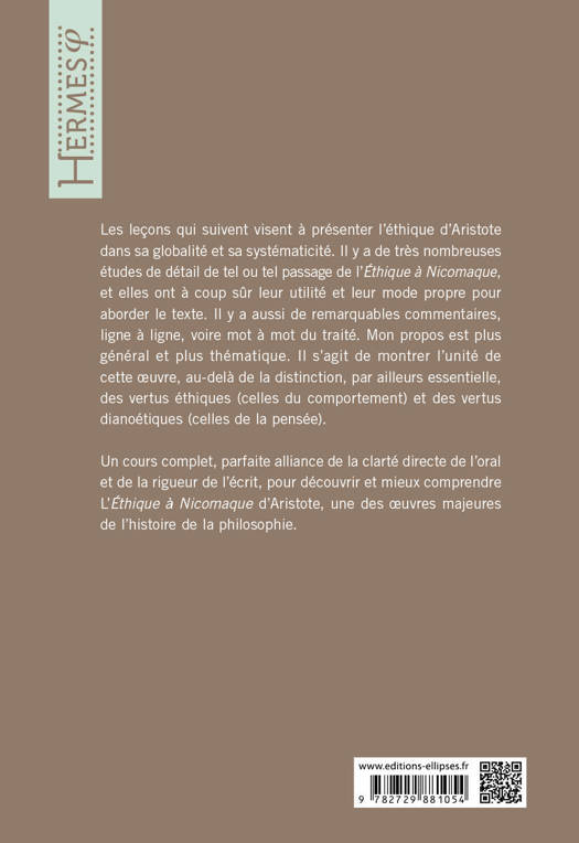 Les leçons qui suivent visent à présenter l’éthique d’Aristote dans sa globalité et sa systématicité. Il y a de très nombreuses études de détail de tel ou tel passage de l’Éthique à Nicomaque, et elles ont à coup sûr leur utilité et leur mode propre pour aborder le texte. Il y a aussi de remarquables commentaires, ligne à ligne, voire mot à mot du traité. Mon propos est plus général et plus thématique. Il s’agit de montrer l’unité de cette oeuvre, au-delà de la distinction, par ailleurs essentielle, des vertus éthiques (celles du comportement) et des vertus dianoétiques (celles de la pensée).