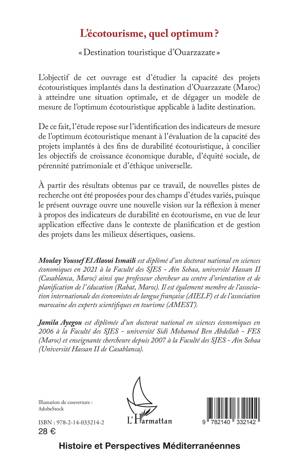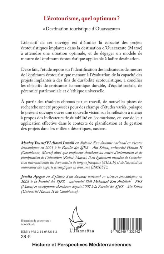 L'objectif de cet ouvrage est d'étudier la capacité des projets écotouristiques implantés dans la destination d'Ouarzazate (Maroc) à atteindre une situation optimale, et de dégager un modèle de mesure de l'optimum écotouristique applicable à ladite destination. De ce fait, l'étude repose sur l'identification des indicateurs de mesure de l'optimum écotouristique menant à l'évaluation de la capacité des projets implantés à des fins de durabilité écotouristique, à concilier les objectifs de croissance économique durable, d'équité sociale, de pérennité patrimoniale et d'éthique universelle. L'ouvrage ouvre une nouvelle vision sur la réflexion à mener à propos des indicateurs de durabilité en écotourisme, en vue de leur application effective dans le contexte de planification et de gestion des projets dans les milieux désertiques, oasiens.