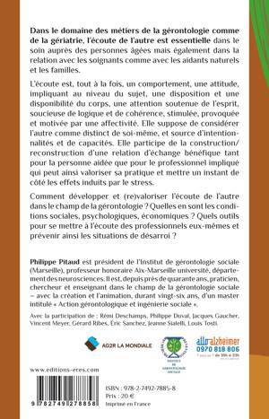 Aujourd’hui le déficit de l’écoute de l’autre est à son apogée, aggravé par le développement des pseudo outils de communication producteurs en réalité d’exclusion et de mise à l’écart des plus faibles d’entre nous, socialement, psychologiquement et économiquement. Or, dans le domaine des métiers de la gérontologie comme de la gériatrie, l’écoute de l’autre est essentielle dans le soin auprès des personnes âgées mais également dans la relation avec les soignants comme avec les aidants naturels et les familles. En ces temps d’incertains de remise en cause de certaines pratiques, comment développer et valoriser cette fonction d’échange, bénéfique tant pour la personne aidée que pour le professionnel impliqué qui lui permet de donner ainsi du sens à sa pratique et de mettre un instant de côté, les effets induits par le stress ? Quels outils pour se mettre à l’écoute des professionnels eux-mêmes et prévenir ainsi les situations de désarroi ?