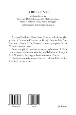 Dans un XIXe siècle en pleine mutation, où les révolutions politiques, l’essor de l’industrialisation et les transformations sociales redéfinissent la création artistique, l’écriture à quatre mains s’impose en France comme une pratique singulière et féconde. Cette monographie explore les duos d’auteurs qui ont marqué la littérature française, de George Sand et Jules Sandeau aux frères Margueritte, en passant par Erckmann-Chatrian ou encore Souvestre et Allain, les créateurs de Fantômas. Loin d’être une simple juxtaposition de styles, la co-écriture interroge la notion d’auteur, la dynamique de collaboration et les tensions entre individualité et fusion créative. De l’atelier d’écriture aux adaptations théâtrales, en passant par les enjeux éditoriaux et la réception critique, ce livre met en lumière les défis et les succès de ces tandems littéraires. Un ouvrage captivant qui révèle les secrets d’une écriture à deux voix et son impact sur la production littéraire, de la plume romantique aux prémices de la modernité. À travers l’étude de célèbres duos d’auteurs – des frères Margueritte à Erckmann-Chatrian, de George Sand et Jules Sandeau aux créateurs de Fantômas –, cet ouvrage explore l’art de l’écriture à quatre mains. Entre complicité, tensions et enjeux éditoriaux, il révèle comment ces collaborations ont façonné la littérature française du XIXe siècle et interrogent la notion même d’auteur. Une immersion rigoureuse dans les coulisses de la création littéraire à quatre mains.