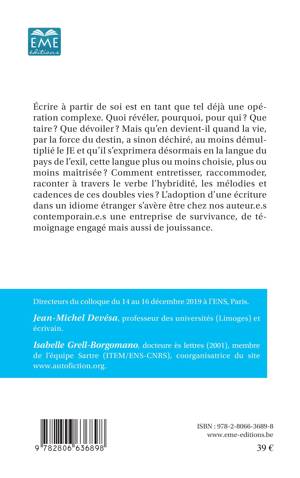 Inscrivant leurs travaux dans la lignée de l'écriture autofictionnelle théorisée et pratiquée par Serge Doubrovsky et alii, Isabelle Grell et Jean-Michel Devésa ont réuni écrivains et universitaires du monde entier à l'ENS-Ulm de Paris afin d'interroger praxis et théories des écritures translingues du « je ». Par les entretiens, les témoignages et les études qu'il renferme, ce livre croisant les perspectives et les domaines littéraires et linguistiques est appelé à s'imposer comme ouvrage de référence.