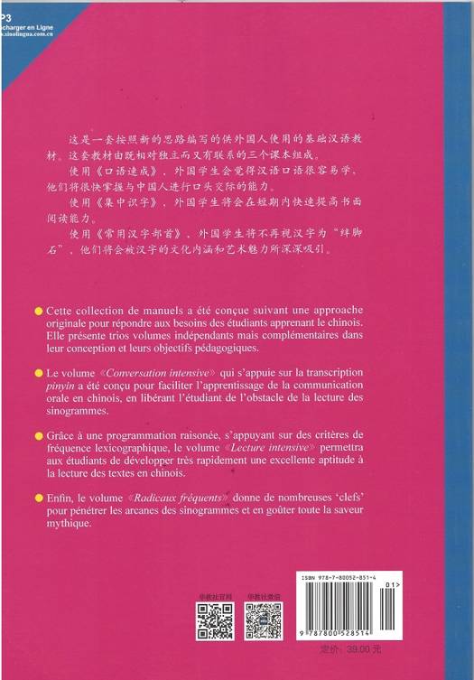 Cette collection de manuels a été conçue suivant une approche originale pour répondre aux besoins des étudiants apprenant le chinois. Elle présente trois volumes indépendants mais complémentaires dans leur conception et leurs objectifs pédagogiques. Grâce à une programmation raisonnée, s'appuyant sur des critères de fréquence lexicographique, le volume "Lecture intensive" permettra aux étudiants de développer très rapidement une excellente aptitude à la lecture des textes en chinois. LIVRE EN FRANCAIS - 1 CD fourni avec le manuel