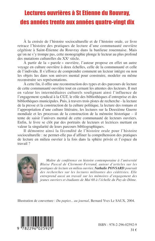 Ce livre retrace l'histoire des pratiques de lecture d'une communauté ouvrière cégétiste à Saint-Étienne du Rouvray dans la banlieue rouennaise, et plonge le lecteur au plus profond des mutations culturelles du XXe siècle. II s'efforce de comprendre comment un lecteur intègre ou non les objets lus dans son univers mental. Il met en valeur les intermédiaires culturels soulignant ainsi l'influence de l'engagement syndical à la CGT, le rôle des bibliothèques d'entreprise et des bibliothèques municipales...
