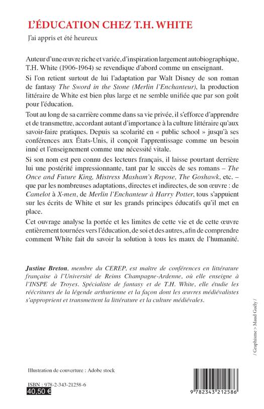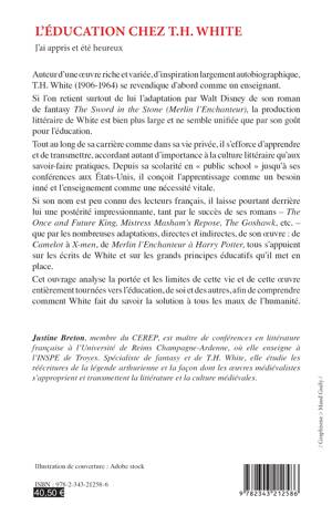 Auteur d’une œuvre riche et variée, d’inspiration largement autobiographique, T.H. White (1906-1964) se revendique d’abord comme un enseignant. Si l’on retient surtout de lui l’adaptation par Walt Disney de son roman de fantasy The Sword in the Stone (Merlin l’Enchanteur), la production littéraire de White est bien plus large et ne semble unifiée que par son goût pour l’éducation. Tout au long de sa carrière comme dans sa vie privée, il s’efforce d’apprendre et de transmettre, accordant autant d’importance à la culture littéraire qu’aux savoir-faire pratiques. Depuis sa scolarité en « public school » jusqu’à ses conférences aux États-Unis, il conçoit l’apprentissage comme un besoin inné et l’enseignement comme une nécessité vitale.