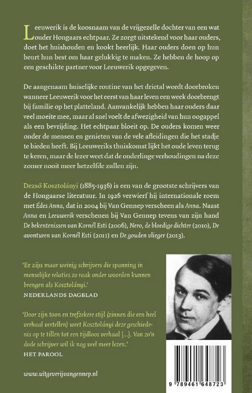 Dezső Kosztolányi (1885-1936) is een van de grootste schrijvers van de Hongaarse literatuur. In 1926 verwierf hij internationale roem met ÉDES ANNA, dat in 2004 bij Van Gennep verscheen als ANNA. Naast ANNA en LEEUWERIK verschenen bij Van Gennep tevens van zijn hand DE BEKENTENISSEN VAN KORNÉL ESTI (2006), NERO, DE BLOEDIGE DICHTER (2010), DE AVONTUREN VAN KORNÉL ESTI (2011) en DE GOUDEN VLIEGER (2013).